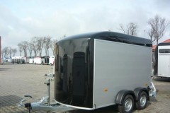 Oferujemy na sprzedaż nową przyczepę dwuosiową, hamowaną z zabudową poliestrową w kolorze ciemnoszarym, ścianami z aluminium oraz drzwiami bocznymi – przyczepa posiada aluminiowy trap wjazdowy – idealna do motocykla czy quada.